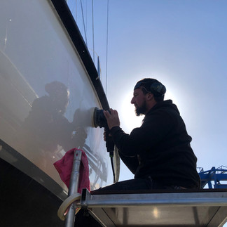 Das bedeutete stundenlanges Schleifen und Polieren, mit diversen Schleifpapierkörnungen von grob bis ganz fein, und bis Kim seine Arme nicht mehr spürte. Glücklicherweise erhielten wir zwischendurch Unterstützung von Freunden, die ein paar frische, kräftige Arme im Gepäck hatten. Der Aufwand zahlte sich aus – die Bordwand glänzte nach der Aktion seidig glatt.